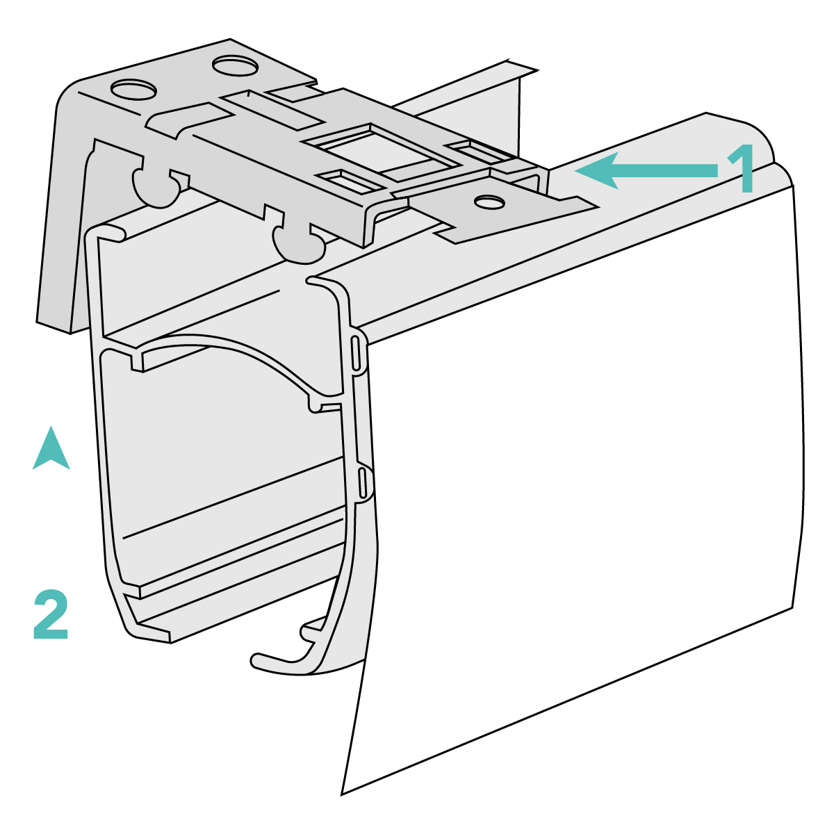 Lift the back of the rail to meet the bracket, push centre of the spring so that it clicks into place securely and release.
