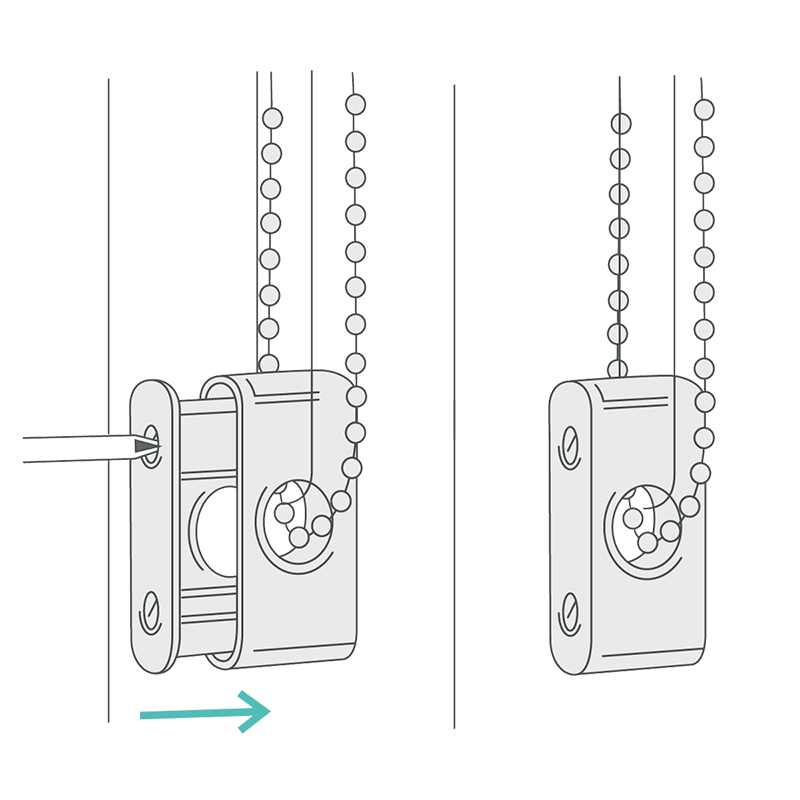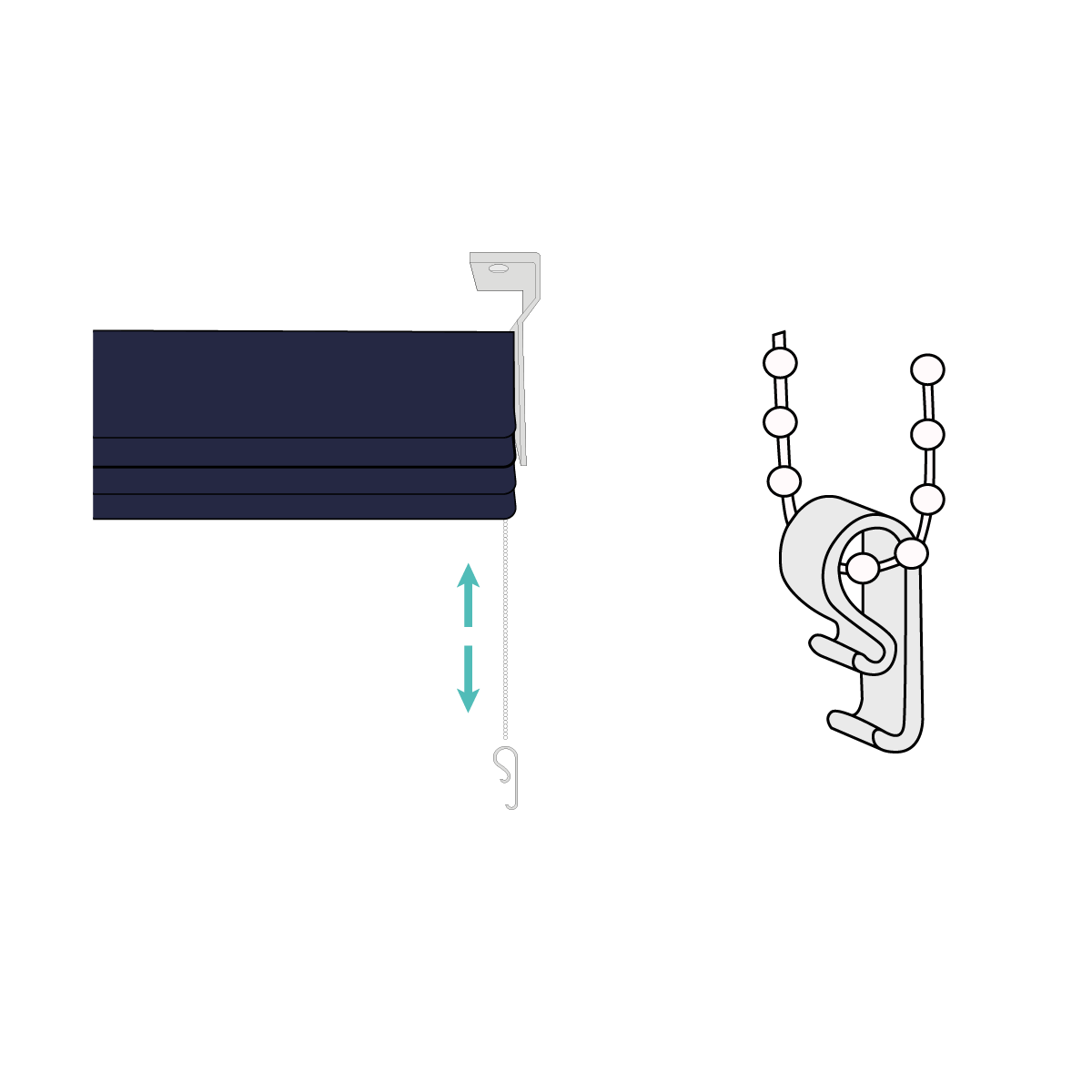 Push connector on stablilising chain onto the ear of each bottom weight. Stablising chain should be connected to both sides of the blind.
