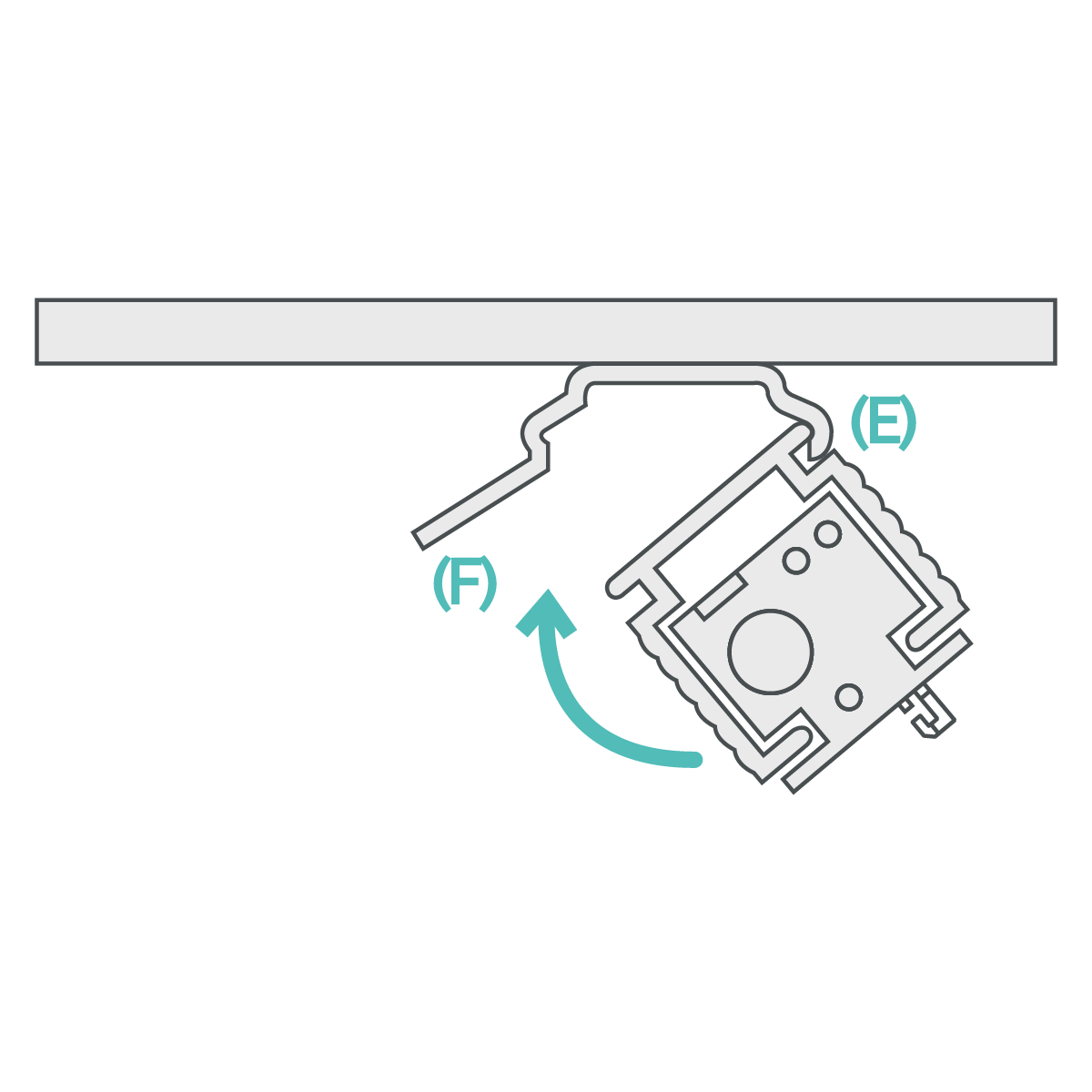Tilt and hook headrail into bracket at point (E). Rotate the headrail into position until it clicks. To release the headrail push the bracket at point (F) as shown in the diagram above.