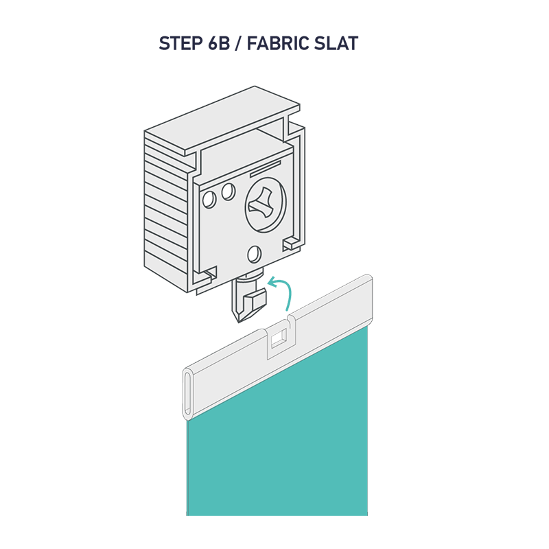 Use this step if your slats are from the fabric range, you can tell by the type of headrail traveller and slat fitting you’ve been supplied. With the headrail fitted hook each fabric slat into the headrail travellers ensuring the traveller pegs are in the open position.