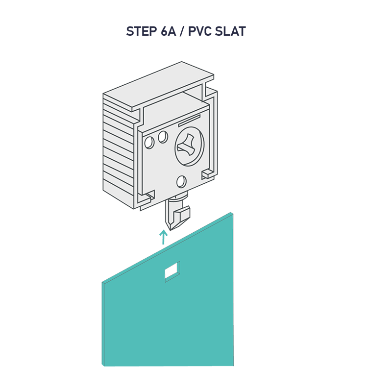 Use this step if your slats are from the PVC/Waterproof range, you can tell by the type of headrail traveller and slat fitting you’ve been supplied. With the headrail fitted hook each fabric slat into the headrail travellers ensuring the traveller pegs are in the open position.