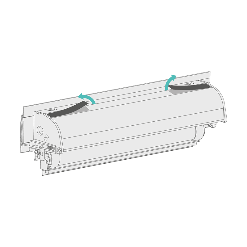 Insert the head rail into the brackets as shown, then push it up until it clicks into place completely.