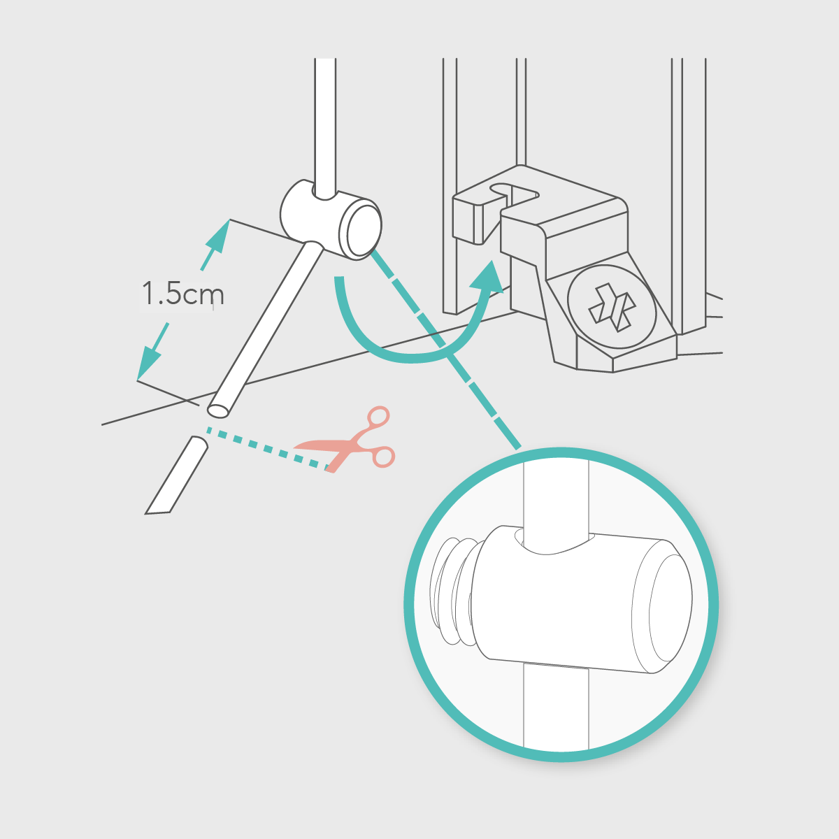 Pull cord to bottom of side channel and secure cord stop in the locking mechanism & trim excess cord to 1.5cm once it is confirmed the blind is working correctly.